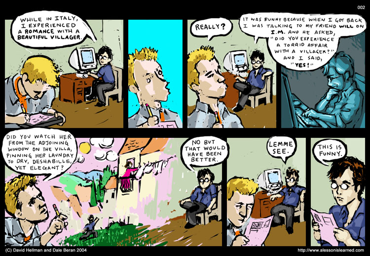People ask us, "where do you get ideas?" and I usually say, "in the bathtub." The truth is, many of our ideas we steal --- from reality. For example, episode one was a real conversation that happened. Dale remembered it and wrote it down, and then I drew it. This episode is based on an afternoon stroll I enjoyed in the lovely hilltown of Spoleto, Italy with a girl named Irene. Her name has at least one more syllable in Italian than in English, which is one of the benefits of living there. Unfortunately, I don't speak any Italian, except "caldo," which I mainly use to mean "please heat my sandwich." Irene knows some English, but the day we took our walk, she had been up all night studying, and her English wasn't working so well. So we could hardly communicate, but at least thanks to that I don't think we noticed anything unlikeable about each other. Honestly, it was a really nice time --- so thanks, Irene. By the way, Spoleto is totally beautiful, and I recommend everyone go, although not at the same time, because that would ruin it. You've got to get lost and meet strangers.